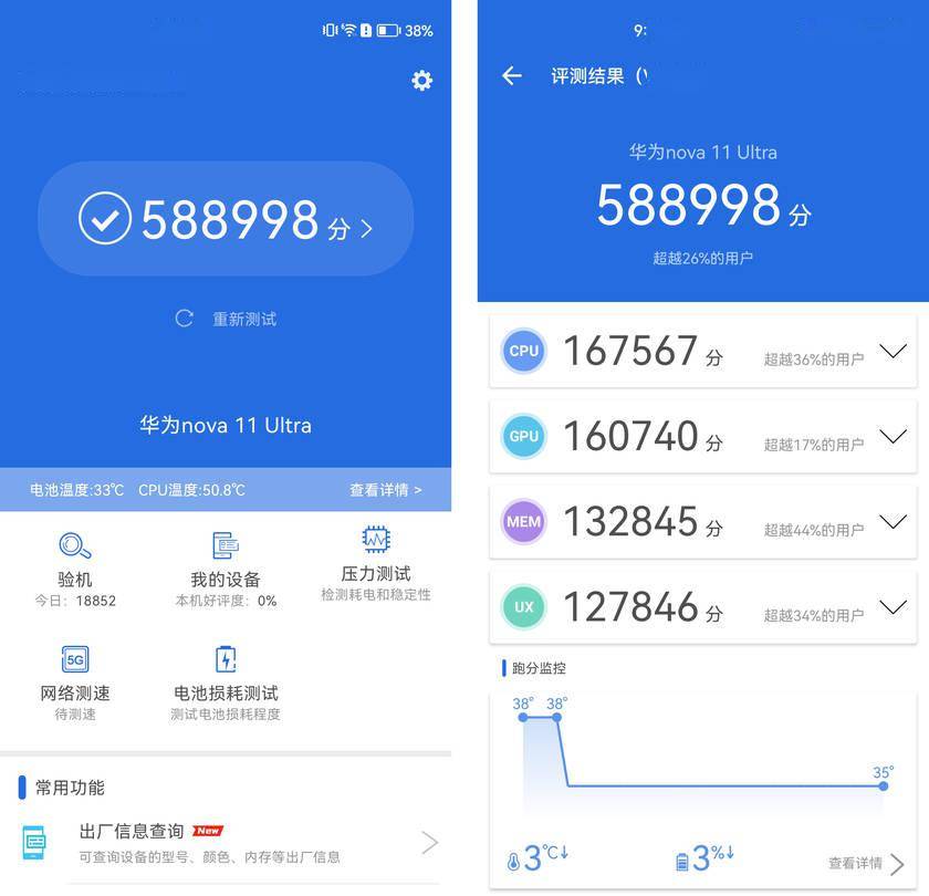 华为nova11 Ultra搭载了12GB+512GB的超大内存与闪存,能确保手机运行时的流畅性。针对游戏性部分,这款手机首发搭载了nova游戏引擎,在软件层面帮助用户获得更好的游戏体验。从跑分来看,华为nova11 Ultra在开启性能模式之后,在安兔兔之中得到了58.8万分的成绩,看见这个分数也许你会和我一样对这款手机的实际性能表现产生一定的担忧,但是在体验过后,所有的担心全都抛之脑后了。