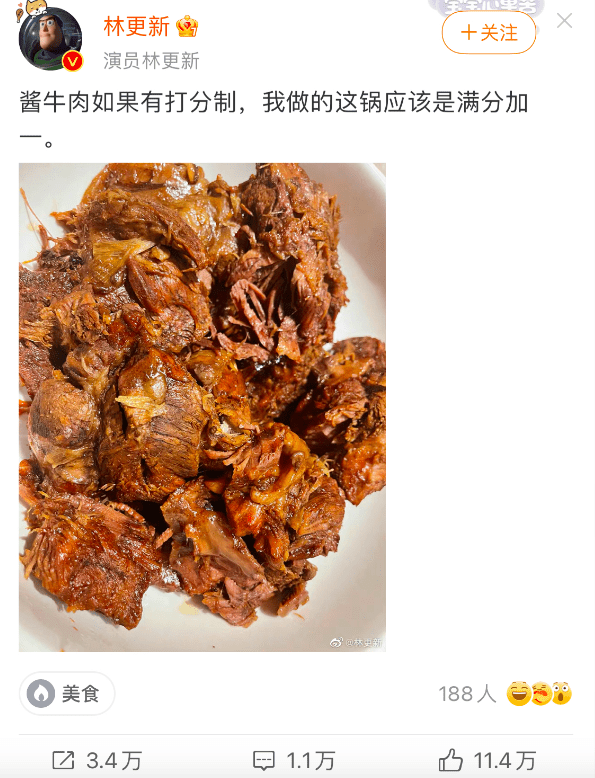这不,就在前几天8月15号的时候,林更新就在个人社交平台上分享了自己做的一盘酱牛肉,并配文称:“酱牛肉如果有打分制,我做的这锅应该是满分加一”,该条动态发出就火了,吸引了11.4万网友的点赞,1万多网友的评论。林更新晒酱牛肉火了,给自己打满分,引11万人点赞,网友:求配方。