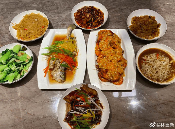 还别说,这一桌子菜做的还相当的好的,荤素搭配,有鱼有肉还有虾,满满一桌子八道菜,也是非常丰盛了,摆盘上也很精致,感觉得到做菜的林更新真的很用心在做,都是营养好吃的下饭菜,不少网友都表示看馋了,还别说,有的家庭主妇真的还不一定可以做出这一桌子的美味呢。