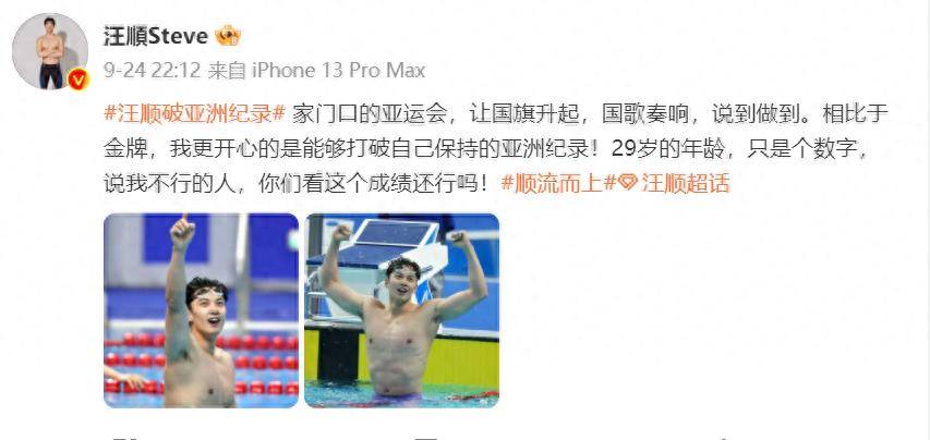 夺冠之后,他在个人社会化媒体上发文:“家门口的亚运会,让国旗升起,国歌奏响,说到做到。比较于金牌,我更高兴的是可以打破自己坚持的亚洲纪录!29岁的年岁,仅仅个数字,说我不可的人,你们看这个成果还行吗!”