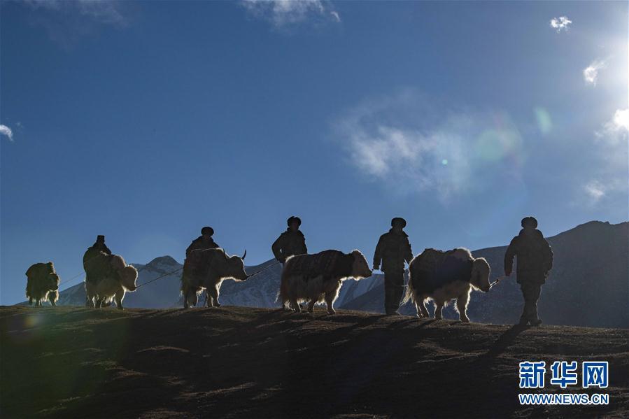 “牛人”小组成员牵着牦牛行进在巡边路上(2020年12月25日摄)。新疆生产建设兵团第三师图木舒克市叶城二草场三连,地处平均海拔4000米左右的昆仑山内地,驻守在高寒区域。作为新疆生产建设兵团海拔最高的边境连队,三连有一支被戏称为“牛人”的团队,他们定时向着峰顶进发,完结巡边使命。 记者 胡虎虎 摄