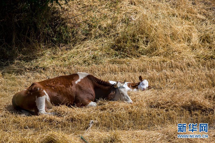在新疆江布拉克景区内,两端牛躺在麦田里歇息(2017年9月10日摄)。 记者 李京 摄