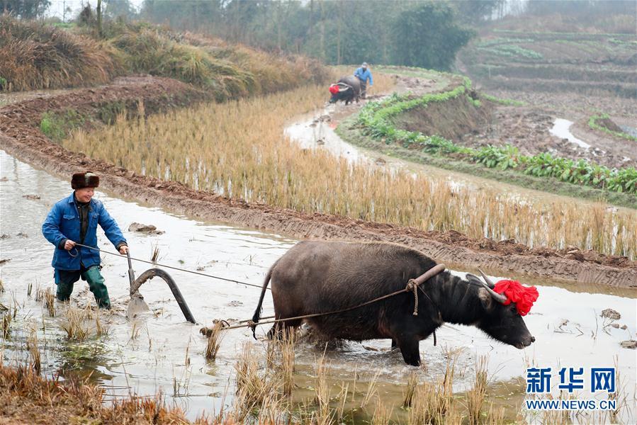 四川省华蓥市明月镇白鹤嘴村的农人在田间“犁春牛”(2021年2月2日摄)。 (邱海鹰摄)