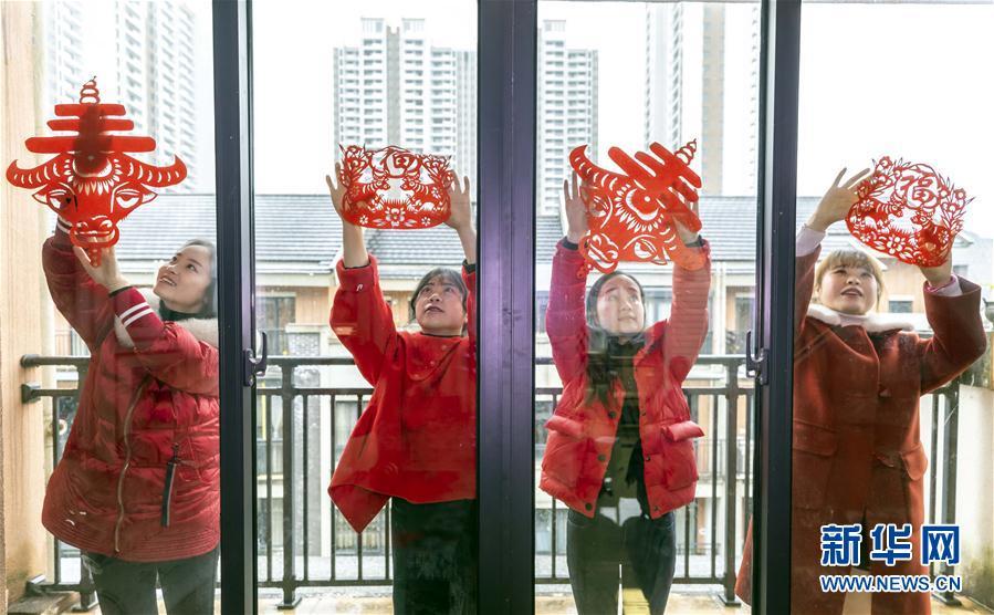在贵州省毕节市黔西县,岳红霞剪纸工作室的学员在贴剪纸(2021年1月17日摄)。 (范晖摄)